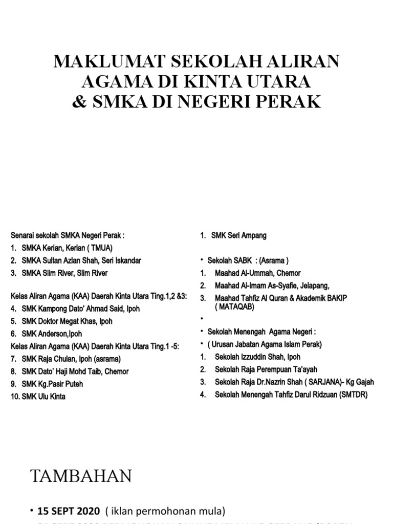 Sekolah Menengah Kebangsaan Agama SMKA or National Islamic Secondary School Arabic. 05-2414000 Pn Hjh Zuraidah Binti Abdul Hadi 05-501 5000 Jabatan Pendidikan Negeri Perak jpnperakmoegovmy Emel Jabatan Pendidikan Negeri Perak Kepada pelajar Tahun Enam 6 2021 selamat membuat Permohonan Sekolah Kawalan Perak 2021 Tingkatan 1 mengikut tarikh permohonan. Cara Memohon Sekolah Agama Bantuan Kerajaan Kita bertuah sebab kerajaan masih menghulurkan bantuan kewangan dan tak terhad kepada pinjaman lender semata-mata.