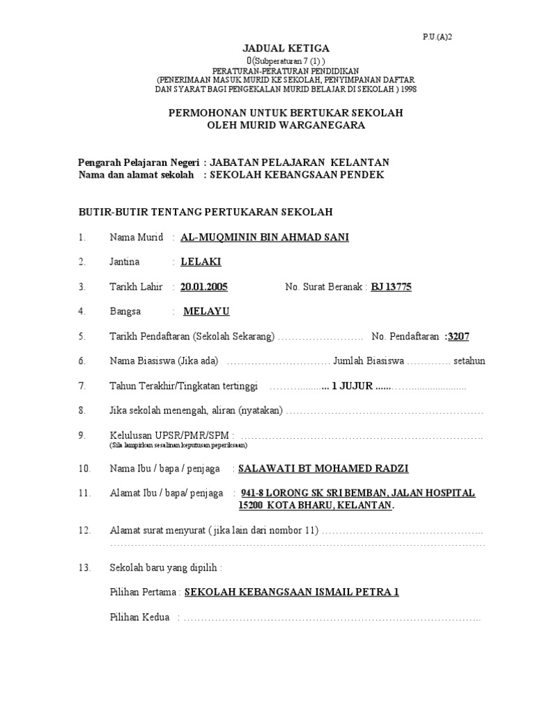 Contoh surat rasmi pertukaran sekolah pelajar rasmi h. Surat tersebut berisi data diri lengkap siswa dan juga data mutasi siswa. Serahkan borang pertukaran Jadual ketiga PUA 275 ke PPD yang berkenaan.